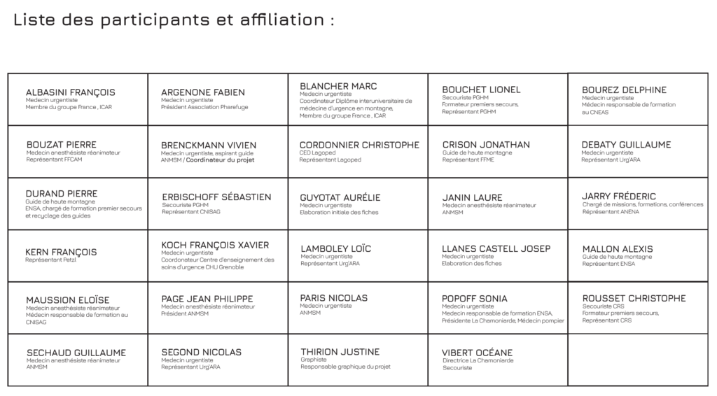 Les fiches de premiers secours ont été réalisées en s’appuyant sur les recommandations de la direction générale de la sécurité civile et de la gestion des crises (DGSCGC) dont le manuel de Premiers Secours Citoyen (PSC) et les recommandations de l’European Resuscitation Council (ERC) ainsi que les sociétés savantes médicales (Société française de médecine d’urgence (SFMU), société française d’anesthésie et de réanimation (SFAR)). La validation des fiches a été réalisée par un comité d’expert réprésentatif des différentes entités participant au secours et à la formation en montagne selon la méthode Delphi, 4 tours ont été nécessaires.